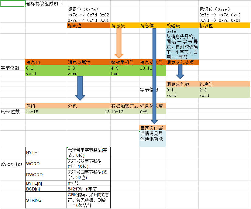 采用Ox7e表示,若校验码、消息头以及消息体中出现0x7e,则要进行转义处理,转义